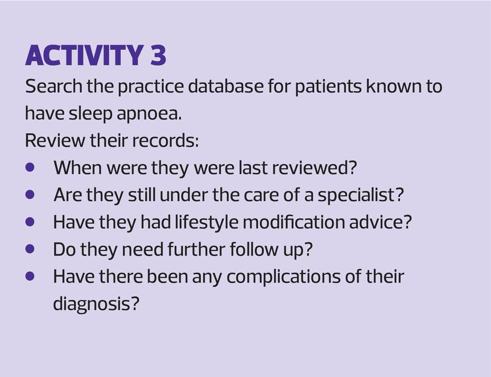 As practice nurses you will encounter people every day who have OSAS or risk factors for the condition. You will be ideally placed to assess, monitor, review and support people with OSAS as a core element of your role.