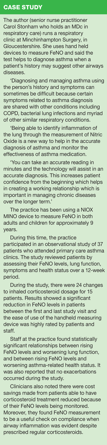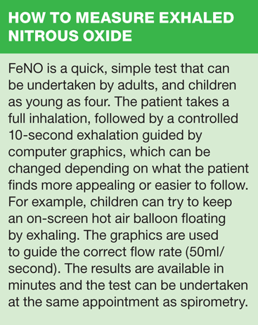 FeNO is a straightforward, non-invasive test that can be undertaken in primary care settings in patients in most age groups. It can be used to aid an asthma diagnosis, or to discount asthma in patients presenting with respiratory symptoms.