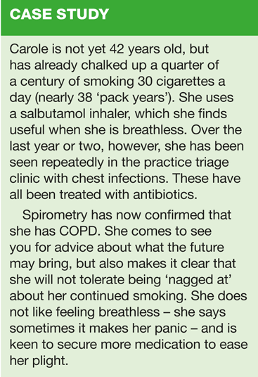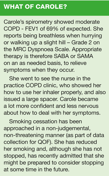 At the moment Carole is symptomatically controlled with just her salbutamol inhaler. However, she still finds the attacks of breathlessness upsetting and is keen to consider other treatments that might prevent an attack coming on.