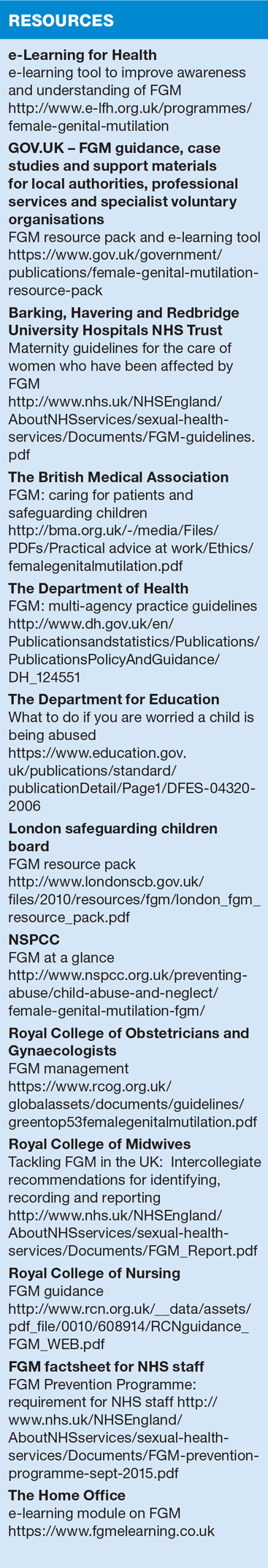 For those patients you see who may have had FGM or are at risk of the practice, it is important to explain what the practice may involve, the possible health complications and the fact that the practice is illegal in the UK. Ensure you offer appropriate support, which may be both medical and psychological, and signpost patients to organisations that offer support and guidance. (See Resources)