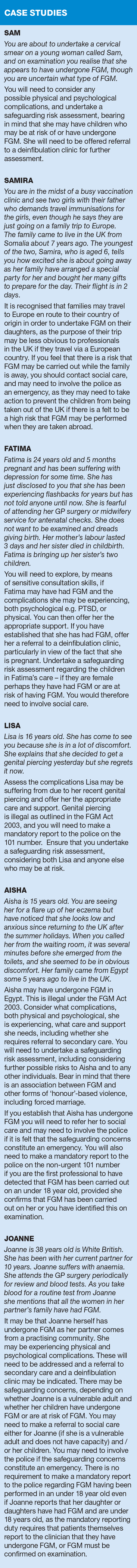 The management of FGM requires the same high degree of sensitivity and empathy as that employed in the management of any other safeguarding matter. Bear in mind that a patient may have a preference for a female clinician and one not from their own community.