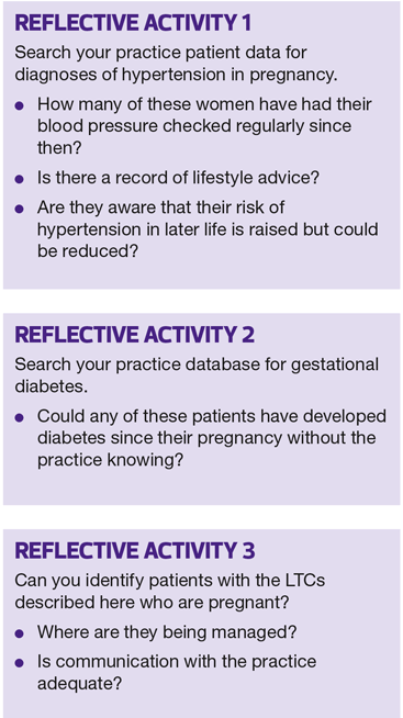 Most pregnant patients with the LTCs covered here will attend specialist clinics and the practice may rarely see them. Nevertheless, they may access primary care at any time with related or unrelated conditions, and it is helpful for practice nurses to have an awareness of the broad principles of their management.
