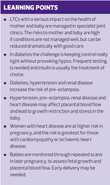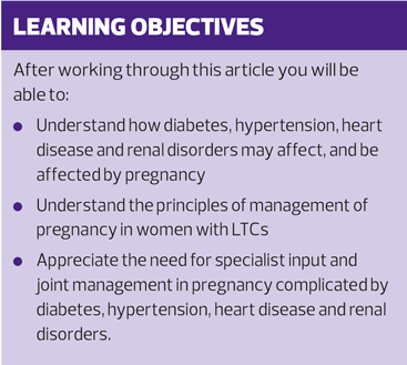 The combination of pregnancy and long term conditions (LTCs) is a challenge for all health professionals. LTCs can affect both mother and baby during pregnancy, and can themselves be affected by pregnancy. In this series we discuss management of LTCs in pregnancy, starting with diabetes, heart disease, hypertension, and renal disease