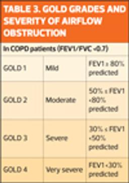 Because there is only a weak correlation between severity of airflow obstruction and symptoms, formal assessment of symptoms using validated questionnaires is also needed. GOLD grades of severity of COPD can be found in Table 3.