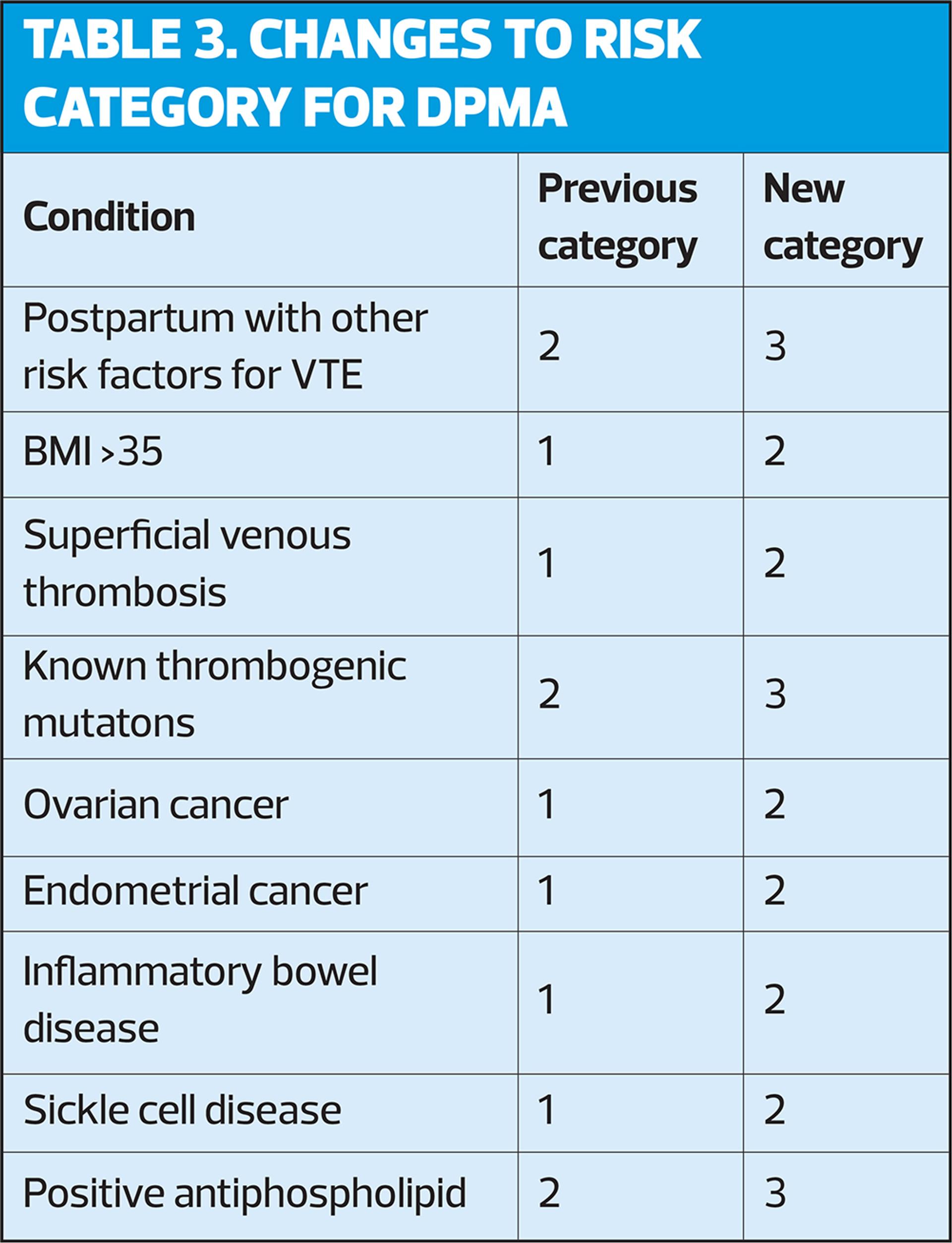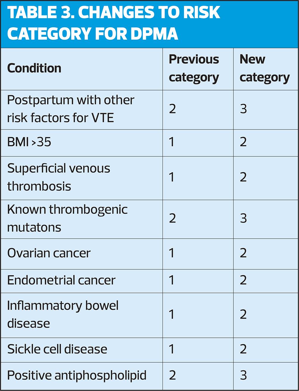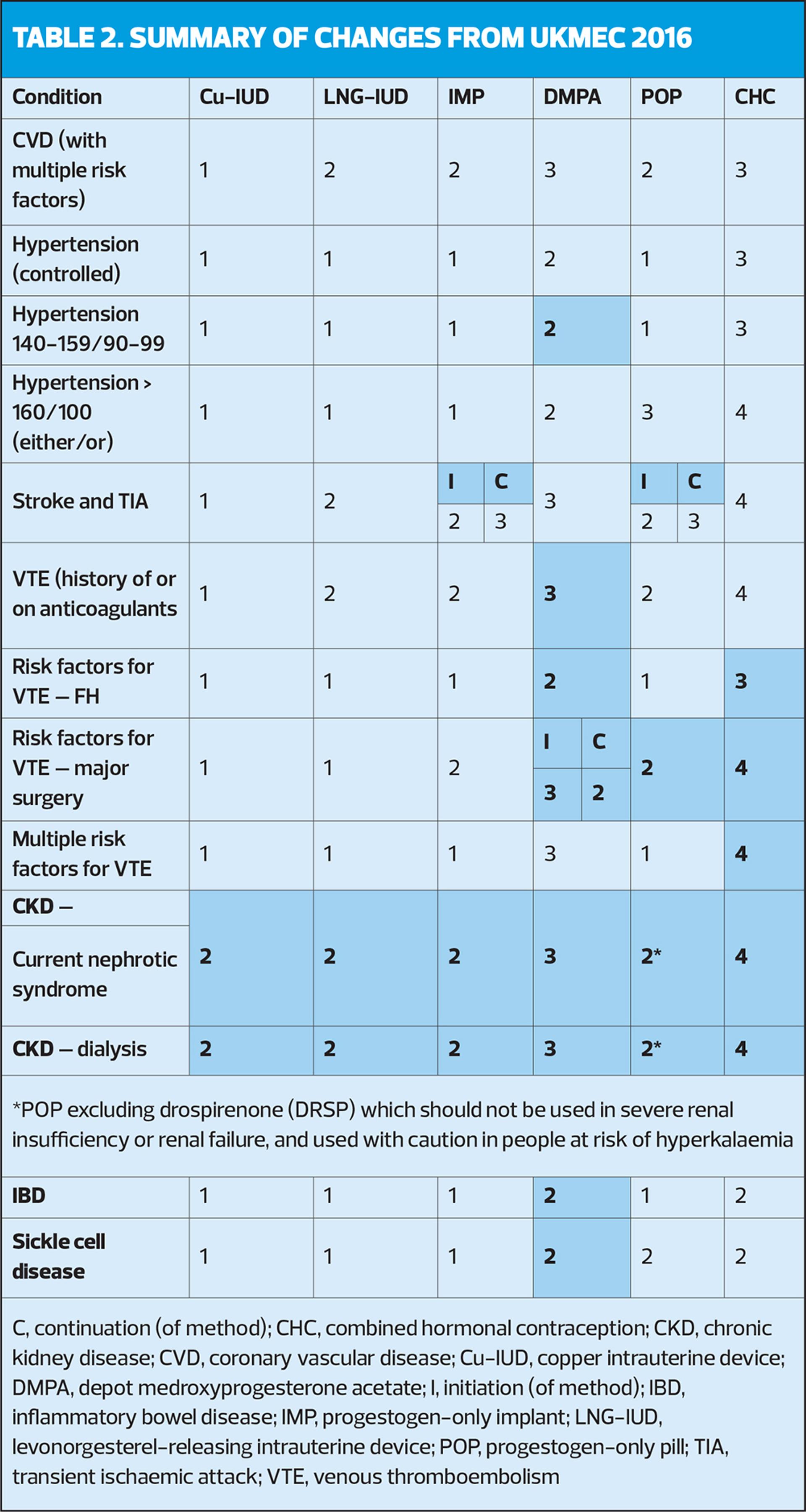 POC includes the progestogen-only implant (IMP), the progestogen-only injectable depot medroxyprogesterone acetate (DMPA), and the progestogen-only pill (POP). Changes to risk categories for DMPA are shown in Table 3.