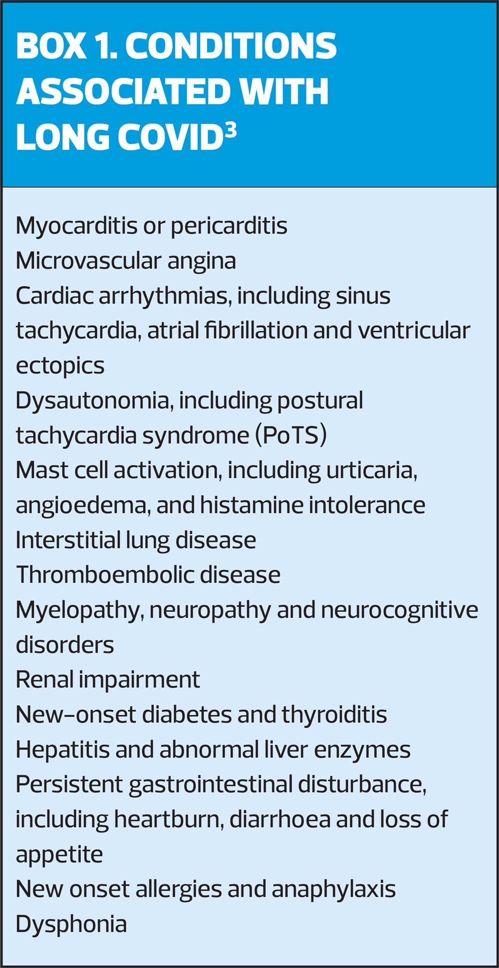 It is estimated that long COVID affects over 1 million people in the UK.1 The illness commonly has an unpredictable, relapsing-remitting pattern, with significant associated conditions appearing weeks to months into the disease course. These may include cardiac conditions and arrhythmias, interstitial lung disease, renal impairment, and new onset diabetes or thyroiditis (Box 1).2