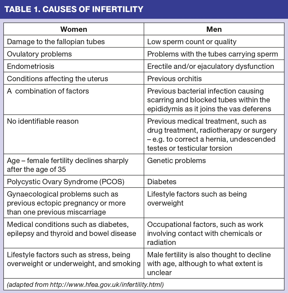 Fertility problems can occur in both men and women and, in some couples, both partners may be affected. The common causes are summarised in Table 1 and fall generally into two headings; hormonal causes and structural causes, including fallopian tube damage and sperm dysfunction.