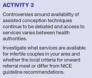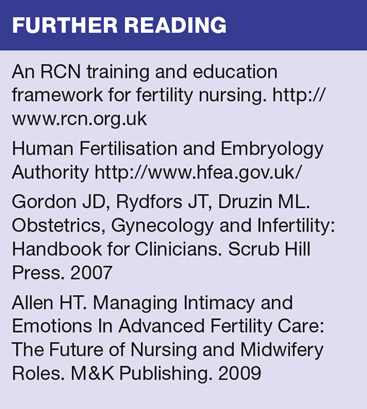 Nurses in general practice who have additional training and support are well placed to assist with initial evaluation and investigations and can offer informed pre-conception and lifestyle advice. However, the emotional and psychological effects of infertility should not be underestimated and nurses often feel they lack the skills to provide support. Yet it is often the nurse that couples turn to for understanding and assistance during their journey to conception.13 Building a good rapport at an early stage and spending time exploring the expectations and anxieties of the couple will allow a greater understanding of their needs.