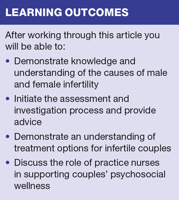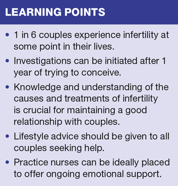 Great strides have been made in the development of assisted conception techniques over the last three decades. For couples embarking on the journey of seeking treatment for infertility the emotional and psychological impacts can, however, be harrowing and can challenge even the strongest relationships.1 Most couples will start their journey in primary care and nurses in general practice are in a position to provide informed, evidence based advice in a sensitive and appropriate way.