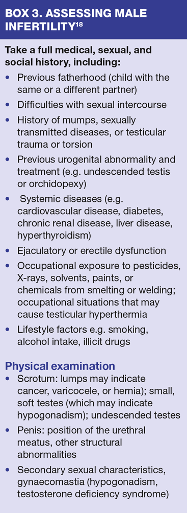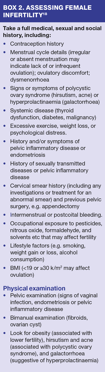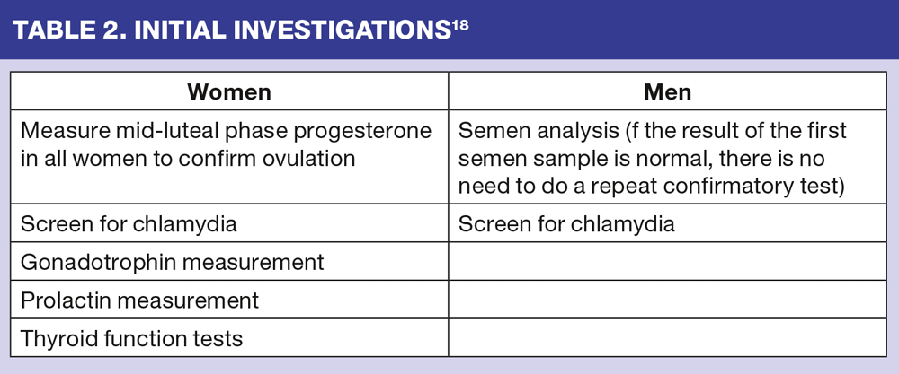 NICE provides comprehensive guidelines on what should be included in an initial assessment of infertility (Boxes 2 and 3) and initial investigations. (Table 2)