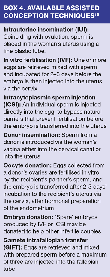 Assisted conception can be defined as treatments that deal with means of conception other than normal coitus. All assisted reproduction in the UK is licensed by the Human Fertility and Embryology Authority (HEFA). Box 4 gives an overview of the available procedures.