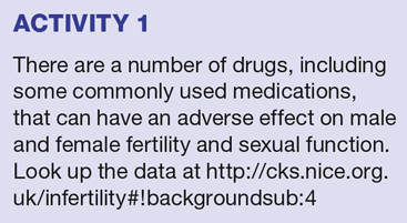 It is worth being aware of a number of less common, although equally important causes of infertility: cervical mucus hostility, where sperm cannot penetrate the cervical mucus, or the production of sperm antibodies by the woman, resulting in sperm immobilisation, are both causes, although rare, of female infertility.4 In recent years lifestyle factors, including obesity or extreme weight loss, increased alcohol consumption, environmental factors and smoking, increasingly influence conception success rates.5-7 There are a number of drugs that can have an adverse effect on fertility and sexual function in both men and women (see activity 1). However, in 25% of cases no identifiable cause can be found, increasing frustration and anxiety for many couples.3