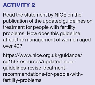 NICE guidelines state that: ‘A woman of reproductive age who has not conceived after 1 year of unprotected vaginal sexual intercourse, in the absence of any known cause of infertility, should be offered further clinical assessment and investigation along with her partner, with earlier referral to a specialist if the woman is over 36 years of age’.3