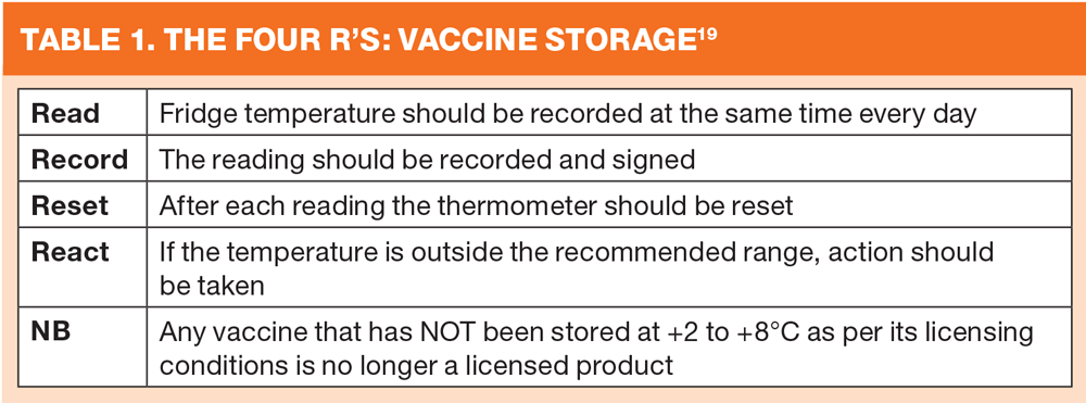 The administration of vaccines to both adults and children is an important part of the practice nurse role. The ‘cold chain’ is the term applied to the process used to maintain optimal conditions during the transport, storage, and handling of vaccines, and begins at the manufacturing stage and ends with the administration of the vaccine to the client. The fridge used for storage of vaccines should be a validated vaccine fridge. Those used for domestic food storage are unsuitable. The optimum temperature for refrigerated vaccines is between +2°C and +8°C and for vaccines to be effective, they must be stored within this temperature range to ensure that they retain their potency. Maintenance to ensure the fridge is working effectively should include making sure the fridge is clean, and there should also be a contract in place to cover servicing and calibration of the temperature gauge. The fridge temperature should also be checked and recorded daily. A protocol for recommended practice for temperature monitoring is shown in Table 1. All vaccine fridges should be subject to annual inspection/servicing and service logs maintained.6