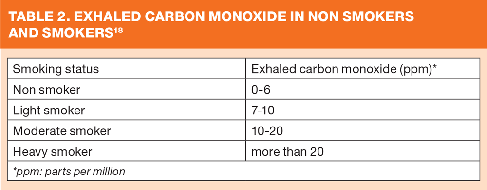 CO monitors measure the concentration of carbon monoxide (CO) in expired air and are an easy, noninvasive, and immediate way of assessing a patient’s smoking status.16 Practice nurses may find these useful in smoking cessation clinics as measurements should decrease over time once the patient has quit, reverting to non smoking levels.17 (Table 2) However, they must be accurately calibrated to be useful.