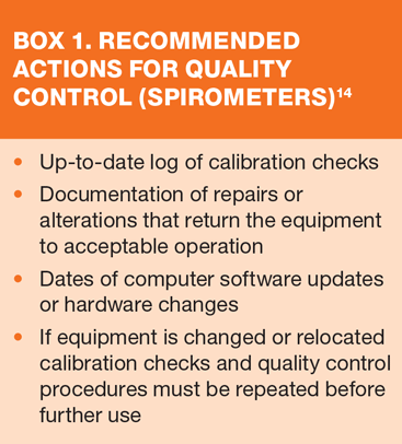 Spirometry has become widely used in general practice and many nurses are now trained in its use and in the interpretation of the findings. It is an extremely useful tool for the assessment of lung function and is used for the diagnosis and monitoring respiratory diseases, especially asthma and COPD. Calibration checks must be carried out with all types of spirometer as a daily routine on each day of use and a log should be kept for medico-legal purposes.14 A 3 litre syringe is recommended for assessing accuracy of the spirometer before use. Guidance suggests that the syringe used to calibrate spirometers must have an accuracy of 15 ml or 0.5% of the full scale (15 ml for a 3l syringe), and the manufacturer must provide recommendations concerning appropriate intervals between syringe calibration checks.14 It is also important to store the calibration syringe appropriately. It should be stored and used in such a way as to maintain the same temperature and humidity as the testing site, best achieved by keeping the syringe in close proximity to the spirometer, but out of direct sunlight and away from heat sources.14 In addition to calibration checks, quality control measures should also be in place to ensure best practice. (See Box 1)