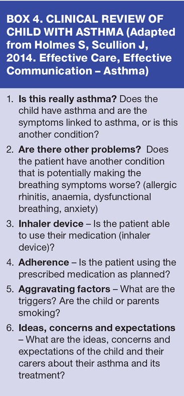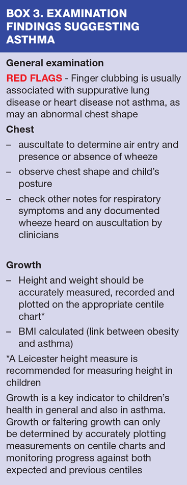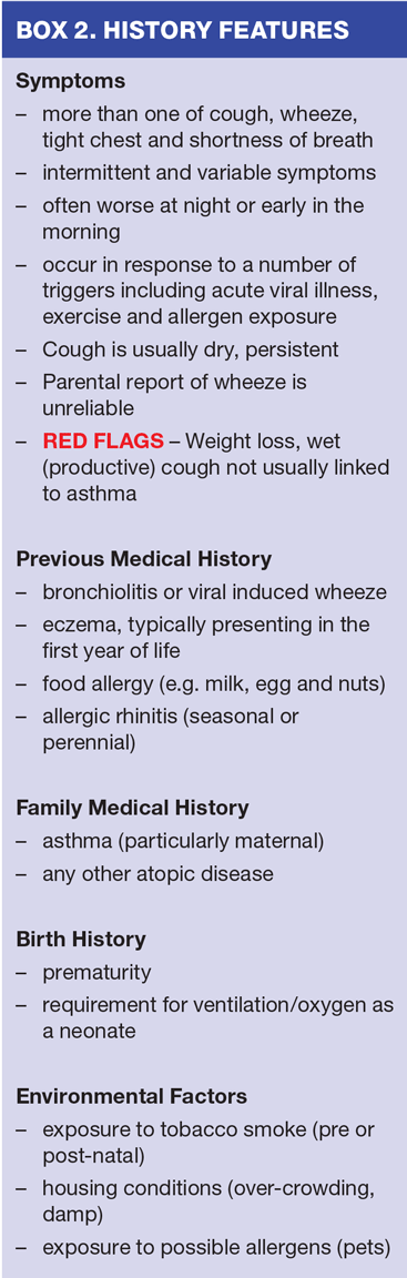 History taking should focus on symptoms, previous medical history, family medical history, birth history and environmental factors. (Box 2) Examination should focus on the chest, child’s growth and typical atopic features. (Box 3) The link between atopy and asthma is soundly proven and when there is evidence of atopy, either in the child or an immediate family member, the likelihood of asthma is greatly increased.