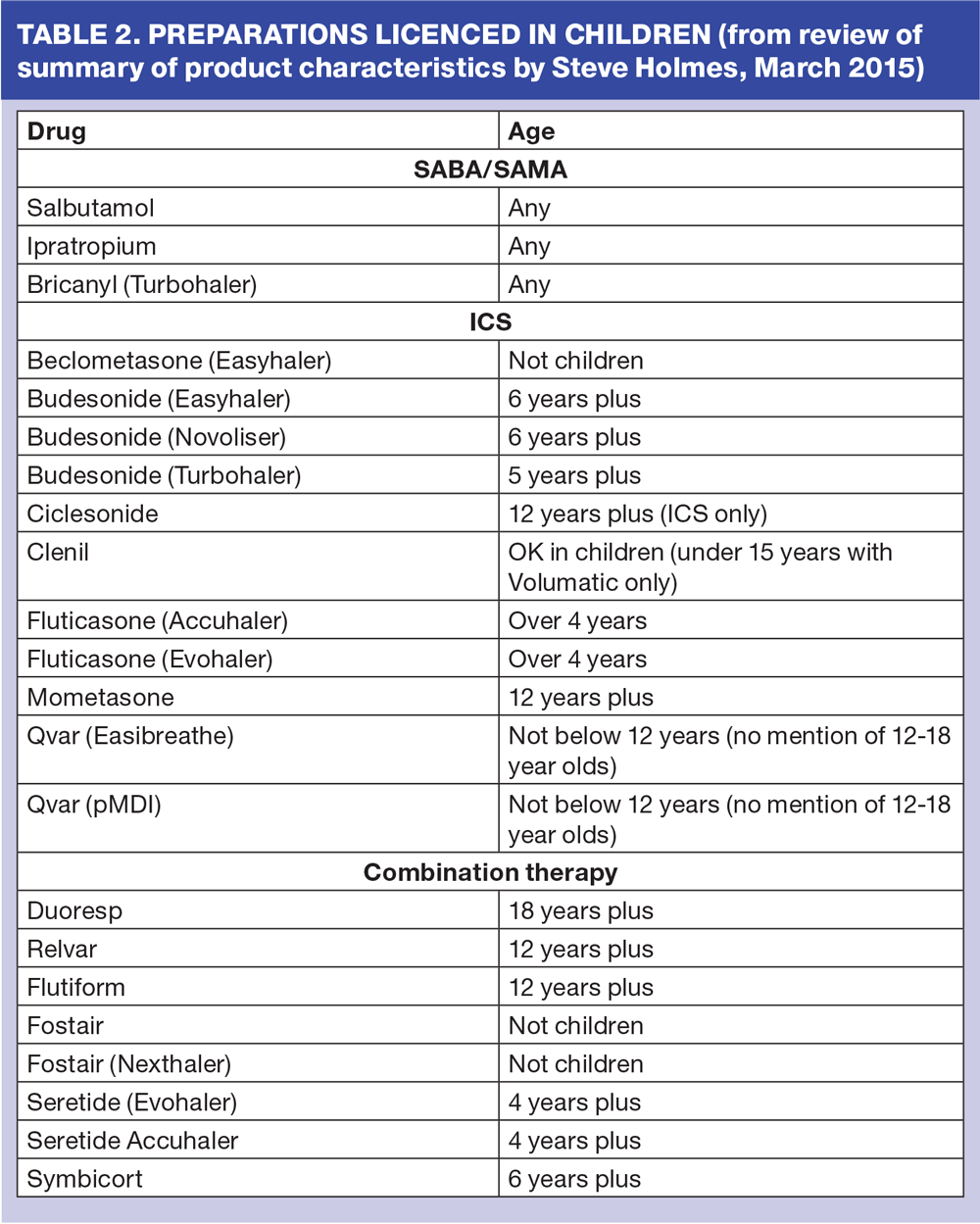 Pharmacological management is relatively straightforward as there are a limited number of drugs licensed for use in children. (Table 2) Usually, in mild intermittent asthma, it would be acceptable to provide the child with one or two short-acting beta agonist (SABA) inhalers per year, but you would not expect both to be fully used. If a child needs to use a SABA inhaler twice a week or more on a regular basis, addition of an inhaled corticosteroid (ICS) is indicated. Further step ups in treatment need to be considered if control remains poor despite good inhaler technique and adherence with ICS. Long acting bronchodilators (LABA) are licensed from 5 years of age and must always be used in combination with ICS. Anti leukotriene receptor antagonists (LTRA) are also an option at step 3 for children over 5 years of age and at step 2 under 5 years.