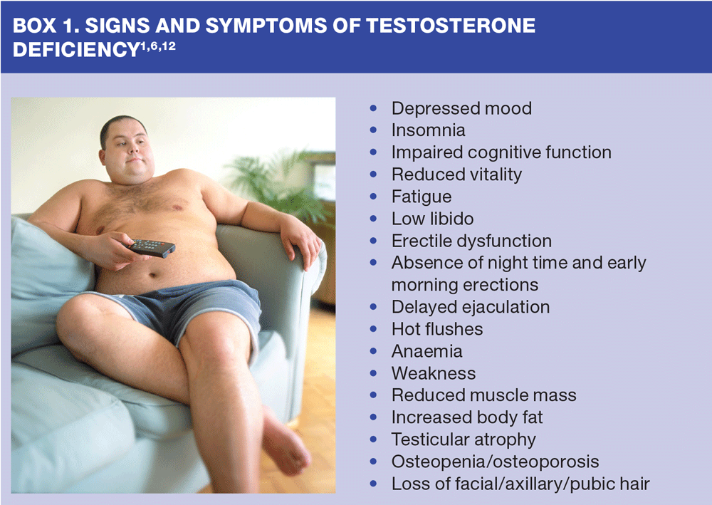The signs and symptoms of testosterone deficiency are listed in Box 1. However, it is important to remember that many of these may be due to lifestyle factors or psychological issues rather than testosterone deficiency. For example, low libido, erectile dysfunction, depressed mood and insomnia may result from stress, anxiety and/or depression. Reduced vitality, fatigue, weakness, reduced muscle mass and increased body fat may result from a lack of exercise and/or a poor diet. A diagnosis of ‘treatable’ hypogonadism is therefore based on clinical signs and symptoms suggestive of testosterone deficiency in combination with biochemical evidence on blood testing.6 The likelihood of symptoms increases as levels of testosterone decrease.11