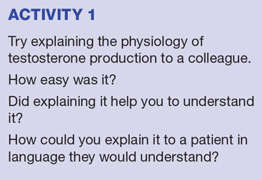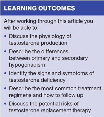 The so-called male menopause may seem like a bit of a joke, but in reality declining testosterone levels in middle age and later life can have a significant impact on many aspects of male physiology, and frank testosterone deficiency can adversely affect a man’s health and quality of life. General practice nurses can play a key role in identifying patients at risk, confirming diagnosis and arranging follow up