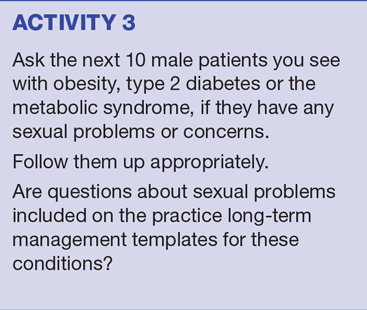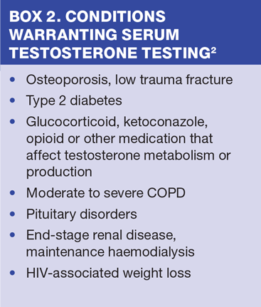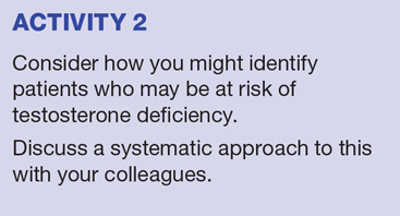 In clinical practice, hypogonadism in adult men is easily missed, even when there are associated symptoms, because these men often ignore their symptoms or attribute them to other causes such as aging.13 The most common presentation of hypogonadism stems from screening investigations for reduced sexual desire and/or ED. We know that hypogonadism is more likely to occur in men with certain conditions, so we should consider routinely asking those at high risk if they have any sexual problems.6 A typical question may be ‘Many men with diabetes have sexual difficulties, is this a concern for you?’