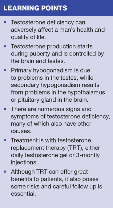 Testosterone deficiency, also known as hypogonadism, is when the body is unable to make enough testosterone to function normally. Testosterone is the most important male sex hormone (androgen). It is essential for the development and maintenance of male characteristics, but it also has effects on sexual function and most major organs including the brain, skin, muscle, bone and kidneys. Low testosterone levels are associated with established cardiovascular disease (CVD) risk factors and an increased risk of death.1 Low testosterone can also significantly reduce a man’s quality of life. Common symptoms include erectile dysfunction (ED), low libido, loss of night time erections, tiredness and depression.