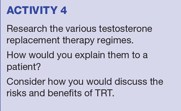 There have been concerns about TRT increasing the risk of prostate cancer. Studies have so far failed to fully resolve this issue, but have been reassuring.18 A PSA test prior to treatment is therefore essential. TRT is currently contraindicated in men with locally advanced or metastatic prostate cancer. Hypogonadal men treated for localised prostate cancer may be considered for TRT after a period of at least 2 years if there is no evidence of residual cancer.6