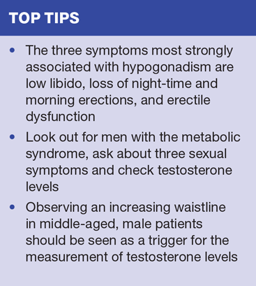 Healthcare professionals should see an increasing waistline as a potential trigger for the measurement of testosterone levels. In addition to this, patients need to be involved in their own care and counselled on an ‘anti-aging programme’, with the aim of becoming more active, eating a healthier diet and watching their weight.