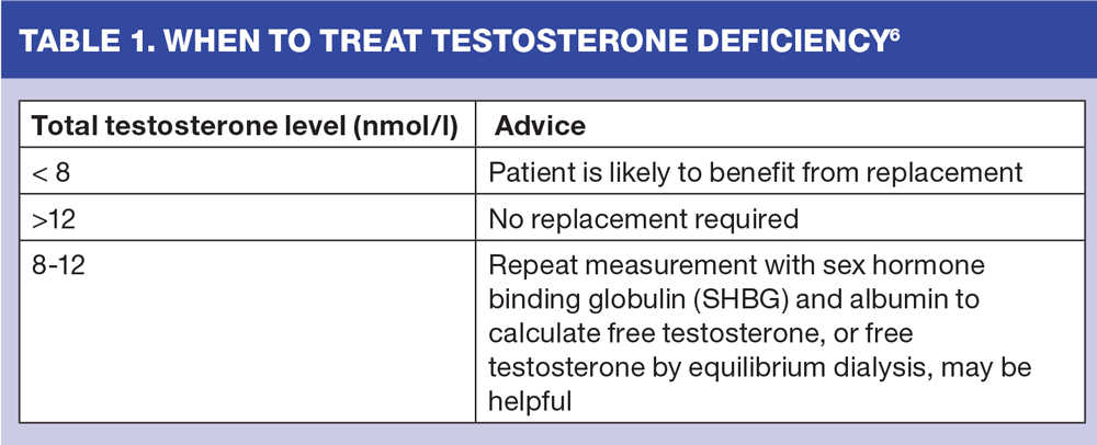 To measure total testosterone, blood should be taken in the morning between 7-11am (preferably at 9am), using a reliable method on more than one occasion.6 Advice on when to treat is summarised in Table 1.