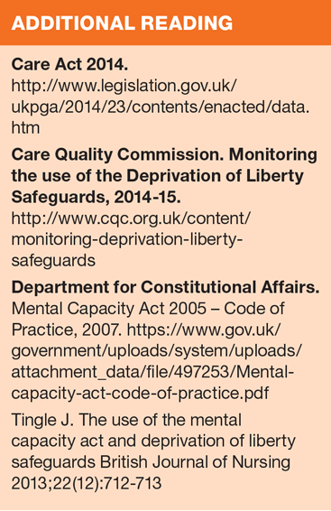 Training in the Mental Capacity Act is mandatory for staff who see patients therapeutically, and for those that do home visits. General practice nurses – and other staff – should have a personal development plan for supervision, which incorporates difficult cases, in order to develop their confidence in dealing with Mental Capacity Act issues. It should also be borne in mind that the Act has a bearing on issues such as gaining consent for treatment. It allows for advanced decisions to be made about care and treatment. It is also important to note that the death of a person subject to a DoLs authorisation is legally classified as a death in state detention and must be reported to and investigated by a coroner under the Coroners and Justice act 2009. This may affect communications with families who wish to arrange a fairly quick burial, as is the case with some families who follow Judaism or Islam.