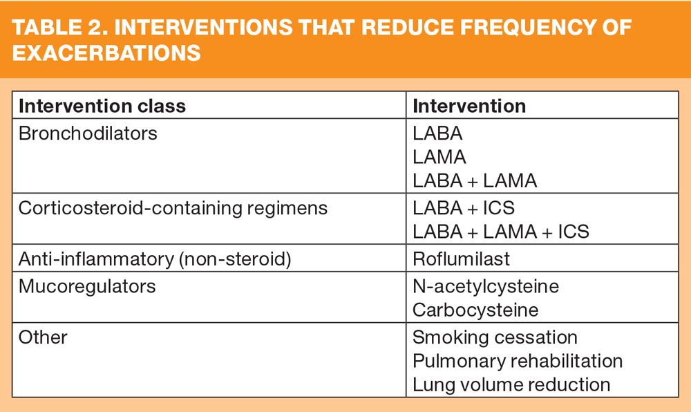 Patients with persistent exacerbations may benefit from the addition of a second bronchodilator (LABA/LAMA), or LABA plus inhaled corticosteroid (ICS). As ICS increases the risk of pneumonia in some patients, GOLD recommends LABA/LAMA.