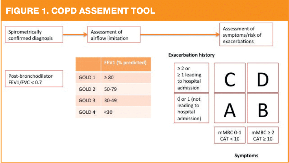 The impact of COPD on the individual patient combines symptomatic assessment with their spirometric classification and/or risk of exacerbations. The ABCD assessment tool from the 2011 GOLD guidance has been updated to use respiratory symptoms and exacerbations alone to assign ABCD categories. (Figure 1) Spirometry remains essential for diagnosis and prognosis, but for many patients with COPD, treatment decisions will be based solely on their ABCD category. In the new assessment scheme, patients should undergo: