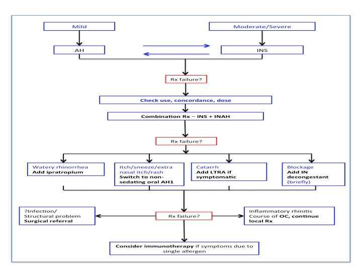 – Nasal (topical H1-antihistamine) – superior to oral antihistamines in relieving symptoms and with faster onset of action. Continuous treatment is more effective than on demand use. Less effective than intranasal steroids in AR. Use first line in mild-to-moderate intermittent and mild persistent rhinitis