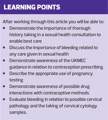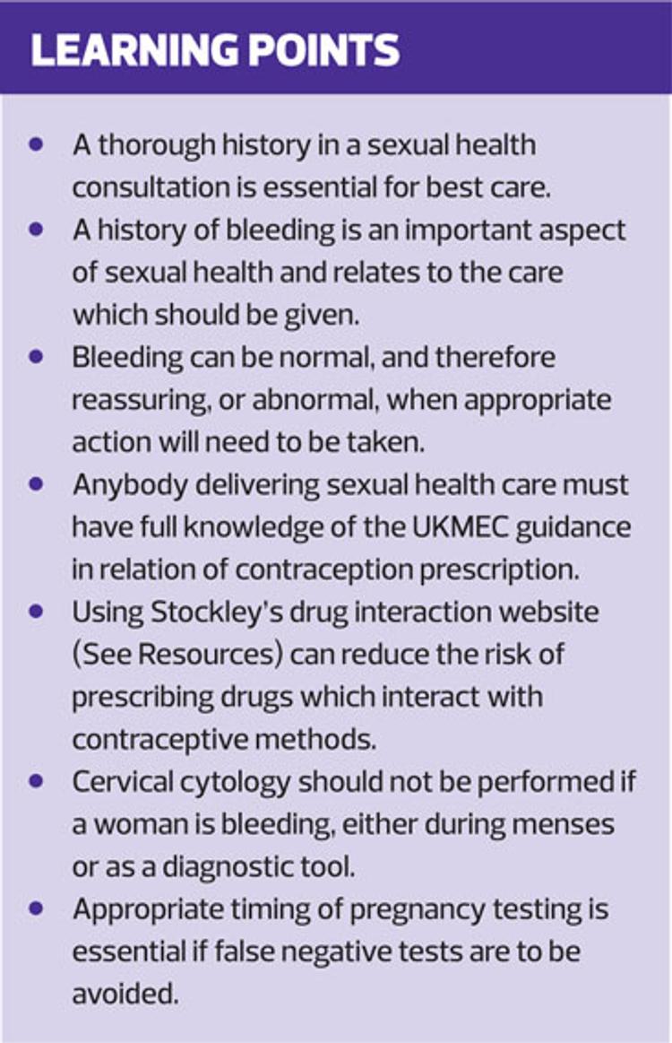 It is acknowledged that you will need training in several fields if you are to give holistic care and fulfil the patient’s expectations. This article focuses on one aspect of care, bleeding, and its significance to contraception, sexually transmitted infection and cytology.