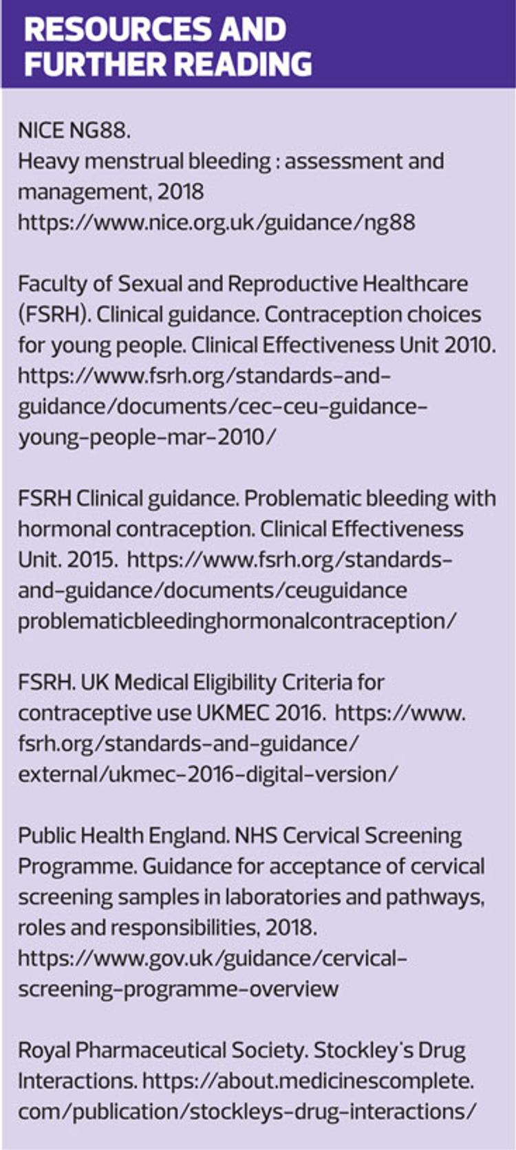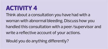 For each consultation, appropriate training will be necessary as well as sufficient time to take a full history. Awareness of the possible causes of unscheduled bleeding and the treatment required is essential so that safe and appropriate care can be given.