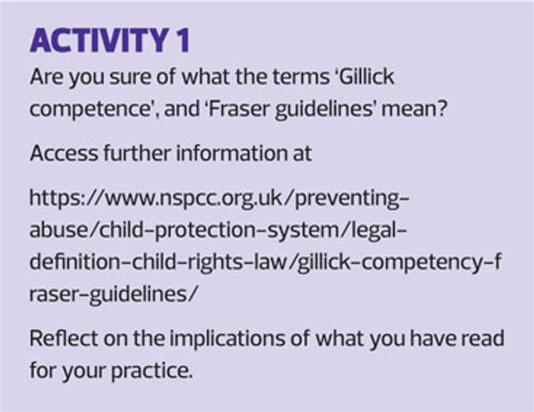 Consultations with young people, without parental knowledge or consent, raise further issues. Gillick competence is the legal term for the assessment of young people under the age of 16, to determine if they are able to give consent to care. It is used by the Courts as well as by health professionals.2 However, the terms Gillick competency and Fraser competency are often used interchangeably and although requests for clarification and consistency of use have been requested,3 confusion still prevails. (See Activity 1)