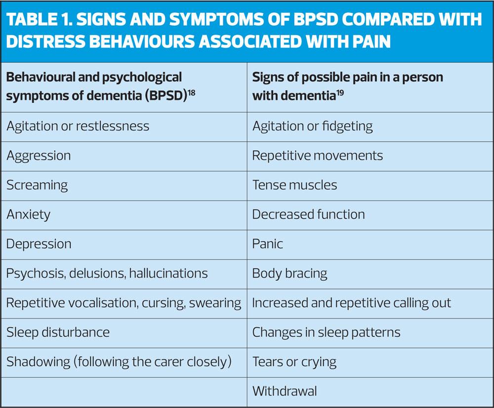 Older adults with dementia are a vulnerable group when it comes to pain assessment as difficulties with communication often lead to pain being missed.17 Pain in people with dementia often manifests as behavioural changes, which can be misinterpreted as the behavioural and psychological symptoms and signs of dementia (BPSD),18 such as agitation, resistive behaviour, sleep disturbance and screaming. These are not dissimilar to the signs and symptoms of distress relating to pain.19 (Table 1). Identifying that Joan had a history of osteoarthritis but was not currently taking any analgesia highlighted this as an area for further assessment.