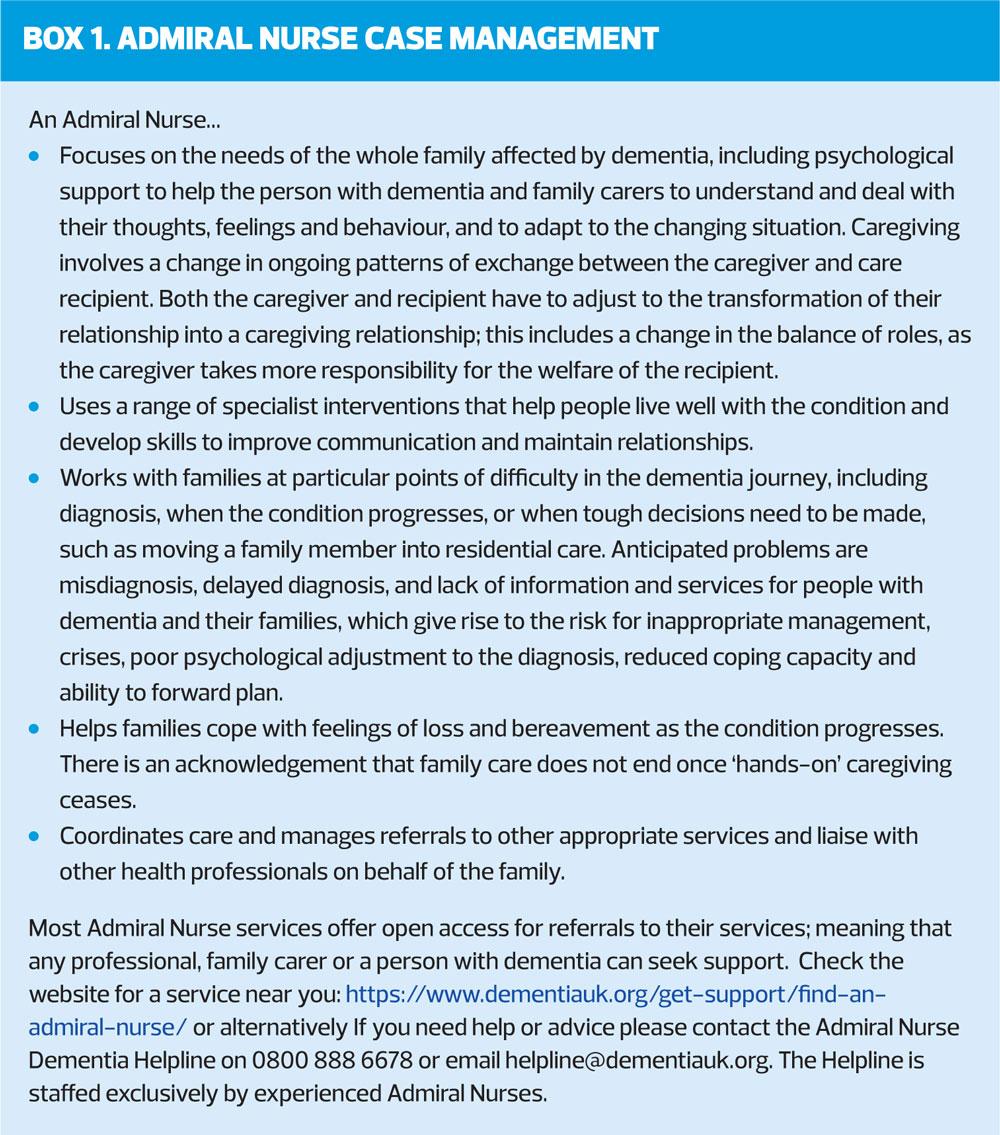 When dealing with patients with dementia or their families and carers, it is important that general practice nurses recognise the limitations of their skills and experience, and in cases such as these, referral to an Admiral Nurse can result in better outcomes for the patient and those close to them.