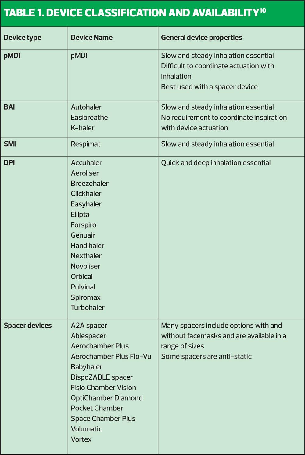 In the UK today, there are at least 20 different inhaler devices in addition to numerous spacers (see Table 1) available for use in the management of asthma and COPD, and with new products coming to market regularly, this number will continue to rise. Furthermore, the range of treatment options available within all of these inhaler devices is vast, and as healthcare professionals aspire to achieve personalised medicine/care for patients, they are increasingly challenged to have good knowledge and understanding of the range of products. Therefore, it makes sense to attempt to classify the devices and the medicines within them because in doing so we can improve our understanding and then apply that to clinical practice. Device selection should be prioritised over product and although not guaranteed, with such a wide range to choose from, should be possible.5