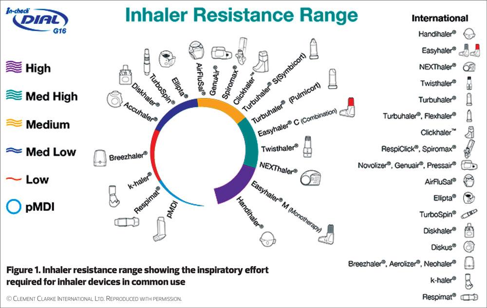 Table 1 outlines the range of devices currently available within each classification and highlights some of their general properties. Inhaler resistance for a range of commonly used devices is shown in Figure 1.