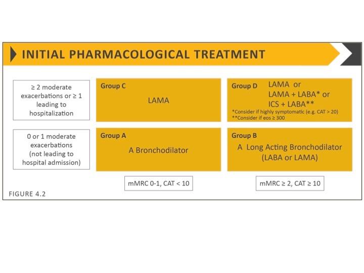 - Long-acting bronchodilators (LABA) and anti-muscarinic agents (LAMAs) significantly improve lung function, dyspnoea, and health status, and reduce exacerbation rates