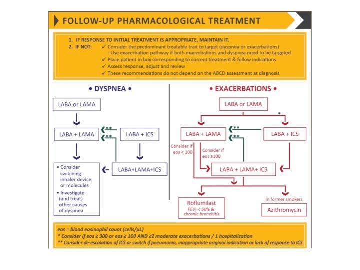 A separate algorithm is provided for follow-up treatment, where management is still based on symptoms and exacerbations, but recommendations are not dependent on the patient's GOLD group at diagnosis. See Figure 3.