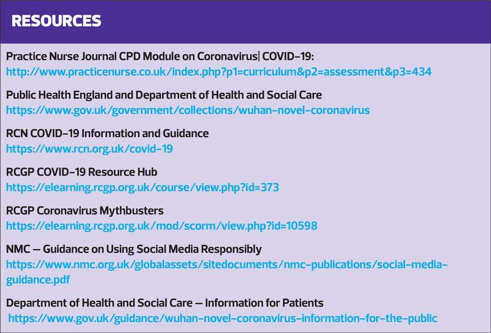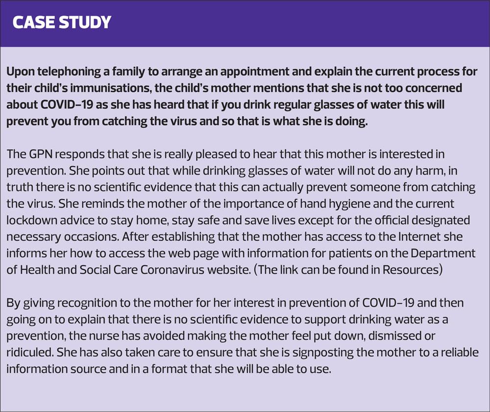 All these interactions are useful opportunities to identify any COVID-19 related misconceptions and to signpost people to reliable sources of information. Research has identified that nurses are the most trusted profession.11 This means you are ideally placed to listen to your patients in order to understand their knowledge and perceptions and then steer them accordingly.