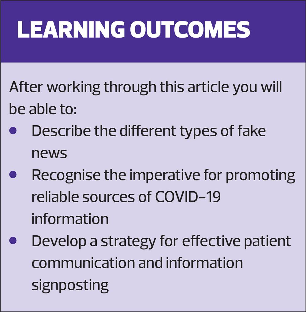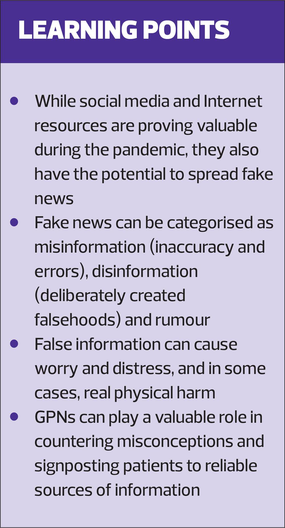 Social media and online sources are rife with misinformation and disinformation, never more so than now. This article will explore the issues surrounding fake news and COVID-19, consider them in relation to the role of the general practice nurse (GPN) and discuss solutions