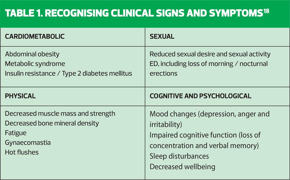 Clinical signs and symptoms are shown in Table 1. These symptoms need not all be present to identify the condition; a diagnosis of testosterone deficiency is based on characteristic signs and symptoms and low serum testosterone concentrations measured on at least two separate occasions.19