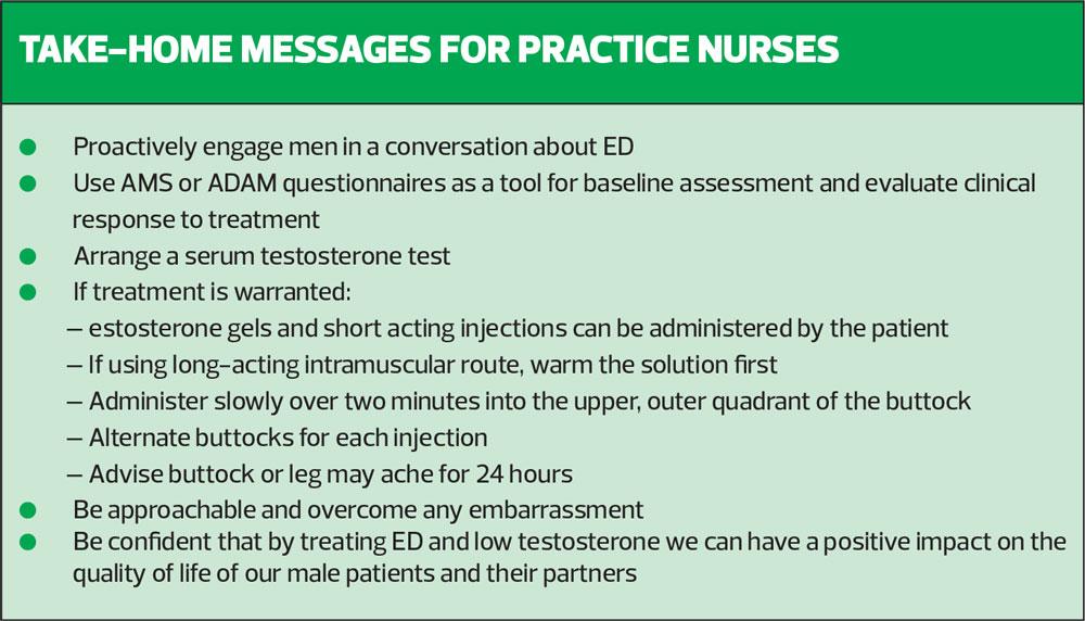 Richard, 48-year-old sales representative, attended for an ECG as he had been experiencing some chest discomfort and was concerned as his father had died after a myocardial infarction at the age of 52. I asked him about his overall general health, he stated that he had not been feeling ‘brilliant’ lately, was tired all the time and had lost all interest in life in general. I proceeded to ask him about his sexual function and he admitted it wasn’t great but had put all his symptoms down to his busy lifestyle and job. I added a serum testosterone level to the bloods that had been requested to assess his cardiovascular risk and asked him if he wouldn’t mind completing a questionnaire. He was ultimately found to have a low testosterone and was treated. This case study shows that with a greater awareness, GPNs can detect these patients during routine appointments.