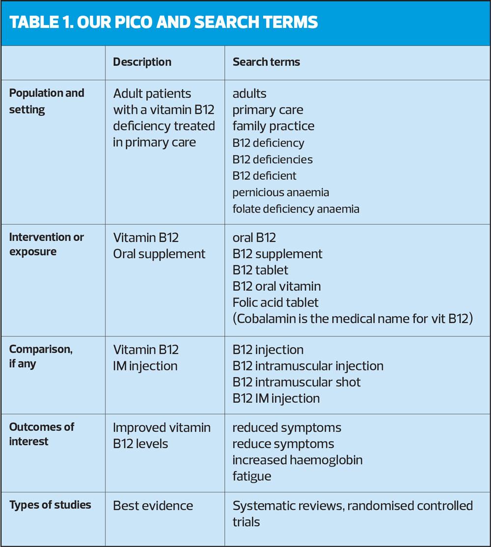 In 2019, the group started to look at the clinical topic of vitamin B12 deficiency. It had been noted that there was a high volume of vitamin B12 injection administrations, and that this was a time-consuming demand on GPN appointments. At the same time, the group was aware that there seemed to be very few patients on oral vitamin B12 (cobalamin) supplements and this provided the impetus for our CAT.