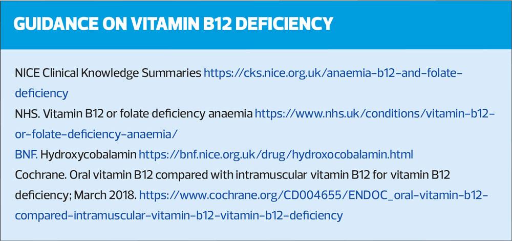 After discussion with Gladys and her daughter, Gladys happily switched to oral supplements, with a repeat blood test arranged for 3 months after the change. The follow-up blood tests demonstrated that serum vitamin B12 levels were 955pg/ml. Gladys no longer required IM vitamin B12, obviating the need for 3 monthly visits to the practice.