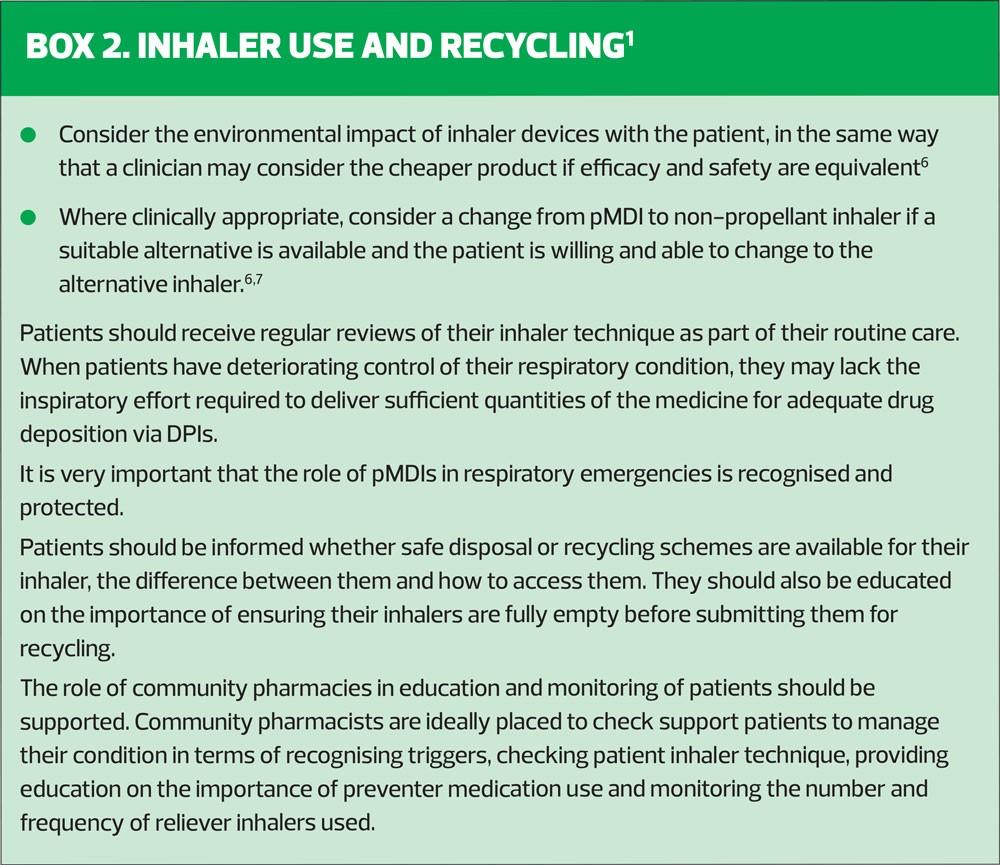 However, switching to a more environmentally friendly inhaler should be undertaken with care and deliberation and the absolute deciding factor will be that the patient can demonstrate a sound inhaler technique. Where it is determined that the most appropriate device for the individual patient remains a pMDI, there are strategies to reduce their environmental impact (Table 2).6 The PCRS also offers a number of points to consider in regard to inhaler device use and recycling (Box 2).1