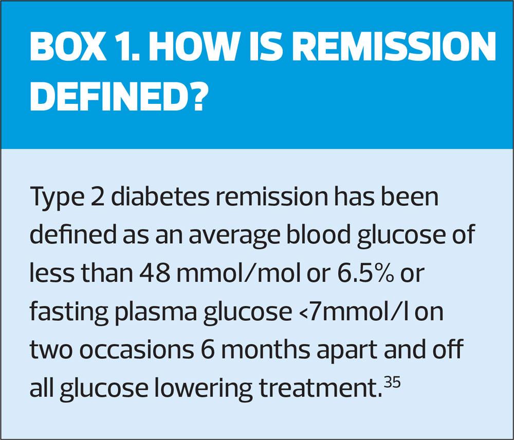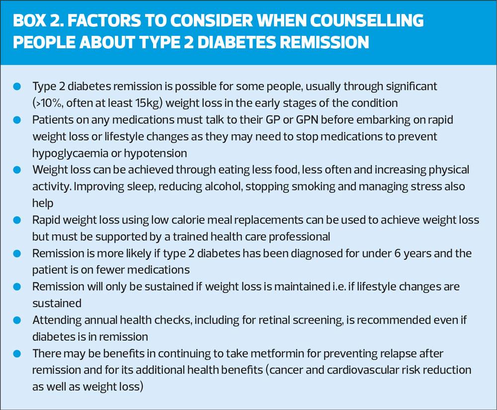 The term remission is preferred to ‘cure’ or ‘reversal’, as it is likely that type 2 diabetes will return if weight is regained or if lifestyle changes are not sustained. When we talk to people about remission, it is important to counsel about the possibility of relapse and the need to continue with lifestyle changes along with annual check-ups, in particular retinal screening as retinopathy can progress despite remission (see Box 2: Factors to consider when counselling patients about remission).